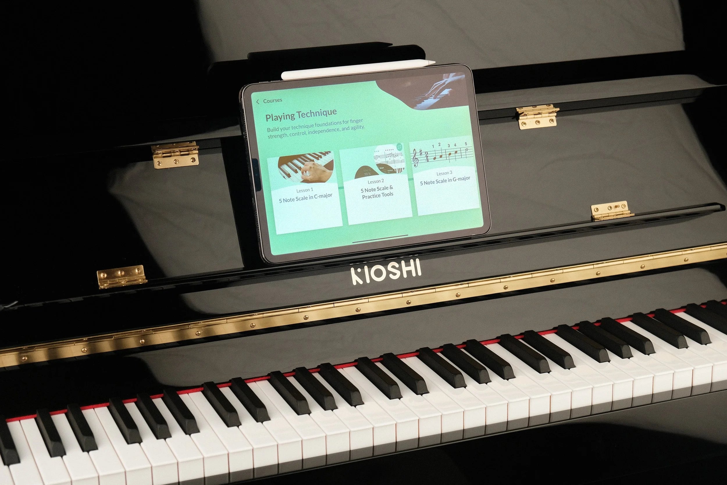 Kioshi makes your acoustic piano smart and intuitive. Use Bluetooth to link with your phone or tablet and dive into interactive learning with apps like Skoove, Anytune, Roland, and Flowkey. Playing and learning has never been easier.